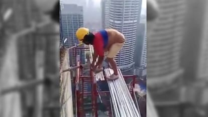 Dos trabajadores de la construcción protagonizan un impactante vídeo que se ha viralizado en redes sociales. A más de 400 metros de altura, en la cima de un rascacielos de Kuala Lumpur (Malasia), dos hombres trabajan sin arneses ni ninguna medida de seguridad. En las imágenes se ve cómo andan sin reparo sobre unos finos tubos de metal para caminar de un lado a otro del andamio.