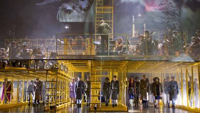 La dialéctica del opresor y del oprimido explora un espacio escénico de imponentes andamiajes, una fortaleza militar cuyo esqueleto metálico aloja a los músicos de la orquesta y los convierte en francotiradores. Calixto Bieito los ha sacado del foso, de la trinchera, para colocarlos en la posición de agresión y de tiranía. No tocan. Ejecutan. Y disparan a discreción a los personajes. Sepultan a los espectadores con la munición de Zimmermann. Y terminan provocando un estruendo de viento y de percusión que evoca un bombardeo sin escapatoria.