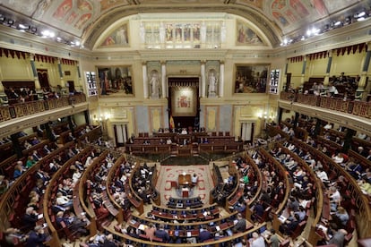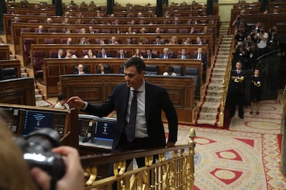 El rey Felipe VI durante la firma del Real Decreto de nombramiento de Pedro Sánchez como presidente del Gobierno.Casa RealEl rey Felipe recibe a la presidenta del Congreso, Ana Pastor, quien le ha comunicado formalmente la investidura de Pedro Sánchez como presidente del Gobierno al prosperar la moción de censura contra Mariano Rajoy. Madrid.POOL (GTRES)Pedro Sánchez, elegido séptimo presidente del Gobierno de la Democracia.ULY MARTINRajoy abandona el Congreso de los Diputados entre aplausos.Claudio AlvarezEl presidente del Gobierno, Mariano Rajoy, y la vicepresidenta del gobierno Soraya Sáez de Santamaria, en el pasillo del congreso tras ser investido presidente el socialista Pedro Sánchez.Diego Crespo (EFE)Saludo entre Pedro Sánchez, nuevo presidente del Gobierno, y Mariano Rajoy en el hemiciclo.uly martínPedro Sánchez, posa para la prensa gráfica como nuevo presidente del Gobierno.Emilio Naranjo (EFE)La bancada socialista aplaude al líder del partido, Pedro Sánchez, tras ganar la votación de la moción de censura en el Congreso.ULY MARTINAbrazo entre Pedro Sánchez, recién elegido presidente del Gobierno, y Pablo Iglesias en el hemiciclo del Congreso tras el debate de la moción de censura.J.J. Guillén (EFE)Pedro Sánchez, nuevo presidente del Gobierno, saluda a Aitor Esteban, portavoz del PNV.ULY MARTINPablo Iglesias, líder de Podemos, vota a favor de la moción de censura.J.J. Guillén (EFE)Votación del portavoz de ERC, Gabriel Rufián.J.J. Guillén (EFE)Margarita Robles vota sí a la moción de censura presentada por el PSOE.J.J. Guillén (EFE)Votación del presidente de Ciudadanos, Albert Rivera.J.J. Guillén (EFE)Mariano Rajoy abandona el hemiciclo tras su intervención durante un receso para preparar la votación de la moción de censura. ULY MARTINEl presidente del gobierno Mariano Rajoy, saluda tras intervenir ante el pleno del hemiciclo del Congreso.J.J. Guillén (EFE)La vicepresidenta del Gobierno, Soraya Sáenz de Santamaría, en el Congreso de los Diputados.Uly MartínMariano Rajoy saluda a Rafael Hernando.J.J. Guillén (EFE)Pedro Sánchez da la réplica a Rafael Hernando en el segundo día de debate de la moción de censura. GTRESMariano Rajoy llega al Congreso de los Diputados.ULY MARTIN (EL PAÍS)Fernando Martínez Maíllo (2d) felicita al portavoz de su grupo parlamentario en el Congreso, Rafael Hernando (d), tras su intervención.Javier Lizón (EFE)Albert Rivera reacciona durante el discurso de Rafael Hernando.Javier Lizón (EFE)El escaño vacío del presidente del Gobierno, Mariano Rajoy, durante la segunda jornada del debate de la moción de censura presentada por el PSOE.Emilio Naranjo (EFE)Rafael Hernando, portavoz del Grupo Popular, durante su intervención en el debate de la moción de censura presentada por el PSOE, "van a entrar en La Moncloa por la puerta de atrás". Javier Lizón (EFE)El secretario general del PSOE Pedro Sánchez aplaude a la portavoz parlamentaria del PSOE, Margarita Robles, tras su intervención.J.J. Guillén (EFE)Margarita Robles, portavoz del grupo socialista, interviene en el Congreso.Javier Lizón (EFE)Vista general del hemiciclo el segundo día que se debate la moción de censura presentada por el PSOE en el Congreso de los Diputados.Emilio Naranjo (EFE)Pedro Sánchez se dirige a los diputados en el hemiciclo.ULY MARTINPedro Sánchez llega al hemiciclo del Congreso.ULY MARTÍNJuan Carlos Monedero estrecha la mano con Pedro Sánchez antes del segundo día de debate de moción de censura en la que Sánchez es candidato.Claudio Alvarez