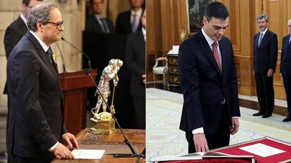 Pedro Sánchez ha tomado posesión sin Jesucristo como testigo desde la cruz, y sin la Biblia disputándole su sitio a las sagradas escrituras de la Constitución. Con Torra, entretanto, sus consellers han tomado posesión ante un Sant Jordi de plata del siglo XV trasladado allí para la ocasión. Los símbolos nunca son neutrales; y la política, desde luego, también se expresa mediante símbolos, que a menudo, como sostenía Camus en su Sísifo, superan las expectativas.