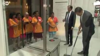 Encantado con la tarea, Rutte bromeó sobre su torpeza y pidió aún una bayeta para quitar las salpicaduras. Le dieron una azul, de las suaves, y la empleada de la limpieza llamó a sus compañeras, que hicieron ademán de completar la labor. Ni hablar. Rutte no pensaba parar hasta dejarlo todo impecable, pero como es muy alto -mide 1,95- se inclinaba para fregar bien el suelo. Las limpiadoras le enseñaron como alargar el palo, y él dio por concluida la tarea entre vítores y aplausos.