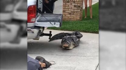 Dos policías y un agente de la Comisión de Pesca y Conservación de la Vida Silvestre (FWC) atan las patas a un caimán de más de dos metros y le ponen una cinta alrededor de la mandíbula para que no pueda atacarlos. El agente da golpecitos con la mano en la boca del animal, tratando de asegurarse de que no puede abrirla. Segundos después, los tres hombres logran cogerlo y lo suben a la parte trasera de una camioneta. Pero el caimán se sacude con tanta agresividad que noquea al agente de la FWC y lo tira al suelo. El vídeo del incidente, que tuvo lugar en Florida (EE UU), fue grabado por un vecino y publicado en su cuenta de Instagram.