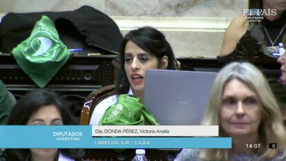 En casi ese día completo que a la política argentina le costó decantarse por reafirmar la independencia y la autonomía de las mujeres para decidir sobre su vida, destacaron algunos discursos. Combativos, emocionales pero cargados de contenido e impregnados de un hastío profundo por una legislación que se mantenía encallada en el pasado. Uno de ellos fue el de Victoria Donda (Buenos Aires, 1977), abogada, política y activista por los Derechos Humanos, que habló sobre aquellas mujeres "secuestradas, desaparecidas y obligadas a parir". "Como si ese útero fuera un botín de guerra y el resultado del útero, que eran los bebés que nacían vivos, también fuéramos un botín de guerra".