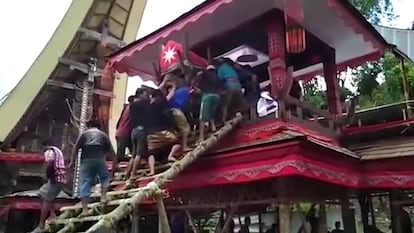 La escalera de bambú por donde transportaban el féretro cedió por el peso en Sulawesi, Indonesia