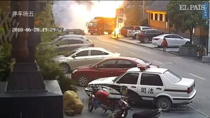 En la localidad de Jianhe, en la provincia china de Guizhou, un camión ha sembrado el pánico. Al entrar en una de las calles principales ha comenzado a arder y las llamas se han extendido rápidamente. En pocos segundos, el vehículo ha quedado completamente calcinado y el fuego ha sido de tal magnitud, que ha afectado también a otro vehículo, a cierto mobiliario de la calle y a un coche que estaba aparcado a escasos metros del lugar. Afortunadamente, el conductor del camión no ha resultado herido porque pudo salir a tiempo de la cabina y protegerse del fuego. Los vecinos de la zona tampoco se han visto afectados por el gran incendio.