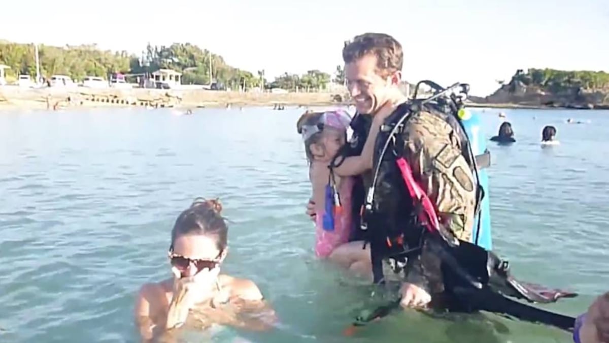 Un soldado estadounidense, equipado con una bombona de oxígeno y gafas de buceo emerge de las aguas en una playa de Okinawa en Japón para reunirse con su familia. Así ha sido la emotiva sorpresa del capitán Hyrum Bronson a su mujer e hijas tras volver de Afganistán. La señora Bronson había llevado a sus hijas a pasar el día en una playa de Okinawa, cerca de la base aérea de los Estados Unidos, Kadena, y lo último que pensaba es que ese día iba a reencontrarse con su marido.