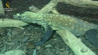 Nunca hasta ahora, según los anales policiales, se había recuperado en Europa un dragón de Komodo. Y el primero que se ha encontrado estaba en Cataluña. El Servicio de Protección de la Naturaleza (Seprona) de la Guardia Civil ha encontrado este martes a un ejemplar maltrecho de este peligroso y gigante lagarto en un local de Cornellá de Llobregat (Barcelona), criado y adquirido ilegalmente junto a otra veintena de animales vivos y especies protegidas. Estos convivían además con decenas de ratones con los que eran alimentados.