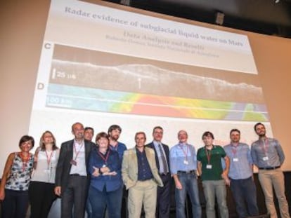 “Es muy difícil saber qué profundidad tiene el lago porque el agua absorbe las señales del radar, con lo que solo vemos su superficie, pero al menos hablamos de una profundidad de un metro”, explica a Materia Roberto Orosei, del Instituto Nacional de Astrofísica de Italia y primer firmante del estudio, que se publica hoy en Science. “Estamos ante una reserva de agua producida por el derretimiento del hielo que se concentra en una depresión del terreno”, señala el astrónomo, que calcula que contiene “al menos cientos de millones de metros cúbicos de agua líquida”. Por ahora, las señales de radar no permiten determinar si se trata de agua líquida pura o de rocas porosas infiltradas con agua.