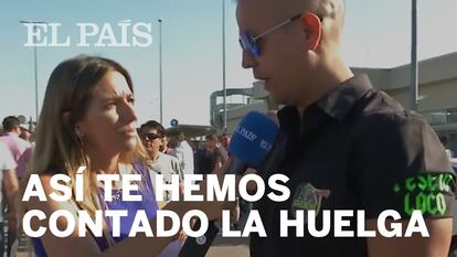 La periodista de EL PAÍS VÍDEO Virginia Martínez ha seguido toda la jornada de huelga de taxistas en Madrid. De la concentración en Barajas a primer ahora de la mañana a la del Ministerio de Fomento, pasando por un viaje en taxi con uno de los huelguistas y la rueda de prensa de Unauto. Puedes ver un resumen con los mejores momentos en este vídeo.