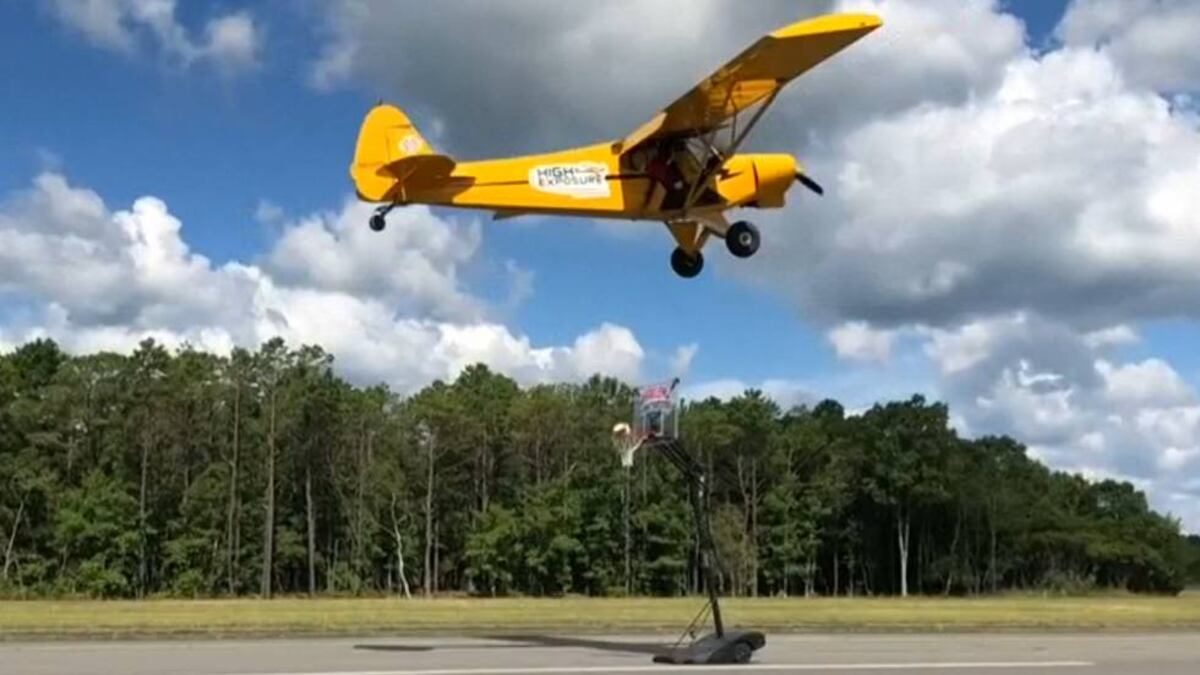 Un integrante de este equipo de malabaristas del baloncesto metió una canasta este miércoles desde una avioneta en Nueva Jersey