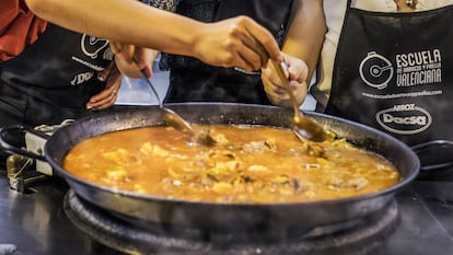 Con el primer chisporroteo del aceite se va animando la clase. Por esta cocina de la Escuela de Arroces y Paella Valenciana ya han pasado unos 13.000 alumnos de 50 países en cuatro años. El curso cuesta 55 euros y dura cuatro horas y media. Con delantal y gorro, cada uno viene con su idea de lo que debe haber en ese recipiente circular de hierro en el que van a cocinar y del que van a comer. Entre risas y selfies, la mayoría prueba hoy los caracoles por primera vez, y van sabiendo que la paella valenciana no lleva marisco —algo de lo que estaban convencidas las alumnas chinas—, que necesitan un arroz redondo y que esto va de compartir, de reunir a los amigos o a la familia en torno a una comida. Cuando casi están terminadas, de pronto suena en la cocina Paquito El Chocolatero. Los alumnos se cogen de la mano y dan vueltas alrededor de los fogones con entusiastas ¡heeey! al ritmo del pasodoble. Uno de ellos, Ed Griffin, se enganchó a la paella hace más de 40 años, cuando vino a Valencia unos meses a estudiar español. La familia con la que vivía organizaba una fiesta cada domingo llena de niños, abuelos y tíos. De vuelta en Estados Unidos, tiraba de libros y de ensayo-error, pero quería saber más: ya es la segunda vez que hace este curso, al que también viene con su esposa y su hija.