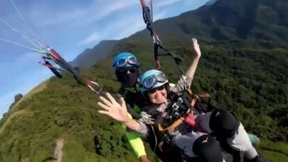 Chin Wu Jui-lin, una mujer taiwanesa de 93 años, ha cumplido un sueño de la infancia al volar en parapente. El salto, desde una altura de 1.000 metros sobre el nivel del mar, fue grabado en vídeo y constituye un récord, ya que Chin es la mujer de edad más avanzada que realiza un vuelo en parapente en Taiwán. Las cámaras colocadas en el parapente reflejan la alegría de la mujer, a la que los 20 minutos que ha durado el descenso se le han hecho cortos. Y aunque se ha mareado un poco en el descenso, no ha dudado en fotografiar el momento para recordar su aventura. Ya en tierra, no a dudado en afirmar que le gustaría repetir la experiencia cuando cumpla 100 años.