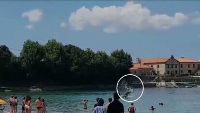 Dos delfines sorprendieron a los bañistas de la playa de Aguete, en el municipio de Marín (Pontevedra). Durante la tarde del pasado jueves, uno de los cetáceos saltó las boyas y se acercó a pocos metros de la orilla. Los socorristas aconsejaron a los presentes que no se acercaran a los animales para no molestarles. El delfín dio saltos en el agua durante unos diez minutos, un tiempo que muchos testigos aprovecharon para capturar con sus teléfonos móviles a su inesperado compañero de baño.