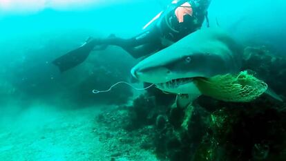 Un buzo español quita una red de pesca enganchada en las agallas de un tiburón
