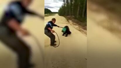 Las autoridades rusas buscan a un oso pardo que deambula con un bidón de plástico en la cabeza después de que se haya hecho viral un vídeo donde se ve a un hombre tratando —sin éxito— de quitarle el recipiente al animal, en la República de Sajá, en el noreste de Rusia.