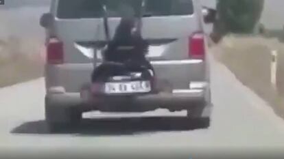 Un conductor grabó en un carretera de Turquía hasta qué punto llega la irresponsabilidad de un padre. Desde su vehículo, vio perfectamente cómo una menor, su hija, de 13 años, iba atada al portabicicletas de la furgoneta. La imagen es sorprendente pero lo cierto es que el hombre declaró, tras ser detenido por la policía, que la niña viajaba en la parte de atrás del vehículo por propia voluntad. Una afirmación que mantuvo también el hermano mayor de la menor, que aseguró que a su hermana siempre le había encantado viajar en el portabicicletas y que, en esta ocasión, no quiso oponerse a su voluntad. Eso sí, para la policía sí es una imprudencia y al darse cuenta del incidente, rastreó el vehículo y al conductor y padre de la niña, tras ver que el vídeo estaba circulando en las redes sociales.