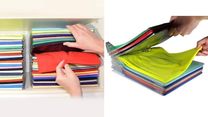 Mantienes tu oficina ordenada, y puedes hacer lo mismo (de forma literal) con tu armario. En Amazon puedes encontrar organizadores para tus camisetas que ayudan a tenerlas como si de un archivador se tratase. Permite plegar, apilar y organizar fácilmente la colada y es muy útil para llevar la ropa en la maleta sin que se arrugue. De hecho, es un best seller en la plataforma dentro de la categoría de organizadores de maletas.