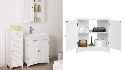 Al igual que sucede con la estantería para el inodoro, afortunadamente hay bastantes opciones de mobiliario en Internet para aquellos que necesitan un espacio extra en el baño. Este en particular viene ya con la forma del pilar del lavabo y solo requiere encajarlo contra la pared, sin obras. En Amazon hay otras opciones de acero por 27,95 euros.