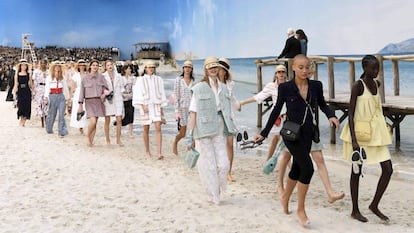 El decorado se inspiraba en los estíos que Lagerfeld solía pasar en las Islas Frisias, en ese gélido Mar del Norte donde veraneaba la burguesía alemana, o bien en los acantilados de Biarritz que tanto apasionaron a Coco Chanel, que abriría allí una de sus primeras tiendas. Aunque, de repente, el canto enlatado de las gaviotas recordaba la impostura. Y remitía, más bien, a esos parques temáticos de inspiración playera y arenales de mentirijilla que abundan en el continente asiático, de los Emiratos Árabes hasta China y Japón, lugares donde reside, a día de hoy, el objetivo prioritario de esta marca.