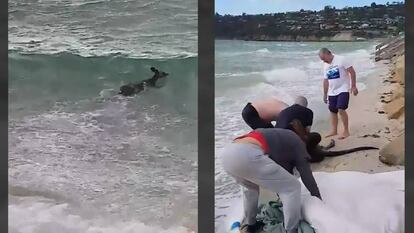 Dos agentes de la policía de Rosebud, en el sureste de Australia, rescataron y reanimaron este sábado a un canguro que desorientado se había metido en el mar en una playa cercana a Marine Drive. Los agentes se dieron cuenta de que el animal se encontraba en apuros y se adentraron al agua para auxiliarlo. "No hubo ninguna conversación en absoluto, ambos sabíamos que eso era lo que había que hacer", afirmó Christopher Russo, uno de los policías, a medios locales. "Saltamos al agua y comenzamos a nadar hacia él. Cuando llegamos tenía sangre y espuma saliendo por la nariz y la boca, síntomas claros de ahogamiento", añadió Russo. Tras sacarlo del agua y realizarle varias compresiones, lo envolvieron en mantas y lo trasladaron a un centro local de vida silvestre, donde se está recuperando.