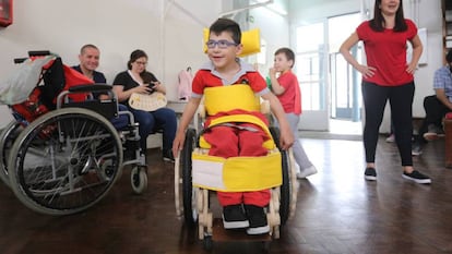 Además de aumentar su interacción al situarle en el mismo plano de conversación que los demás, desde una altura más baja se puede dejar caer al suelo y reptar hasta los juguetes, explica su maestra, Nancy Burguyener. “Está bien integrado porque los niños tienen el corazón tan grande que le ayudan”, se emociona. Aunque reconoce que la discapacidad de Thiago le impide hacer todo lo que querría, como jugar con otros niños al futbolín que hay en el patio. “A veces los compañeros no le dejan porque no maneja bien”.