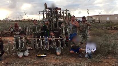 En el vídeo se ve cómo 10 personas, dos de ellas menores de edad, exhiben colgados de palos a 52 animales, cuando en la isla solo se permiten cuatro por día y cazador