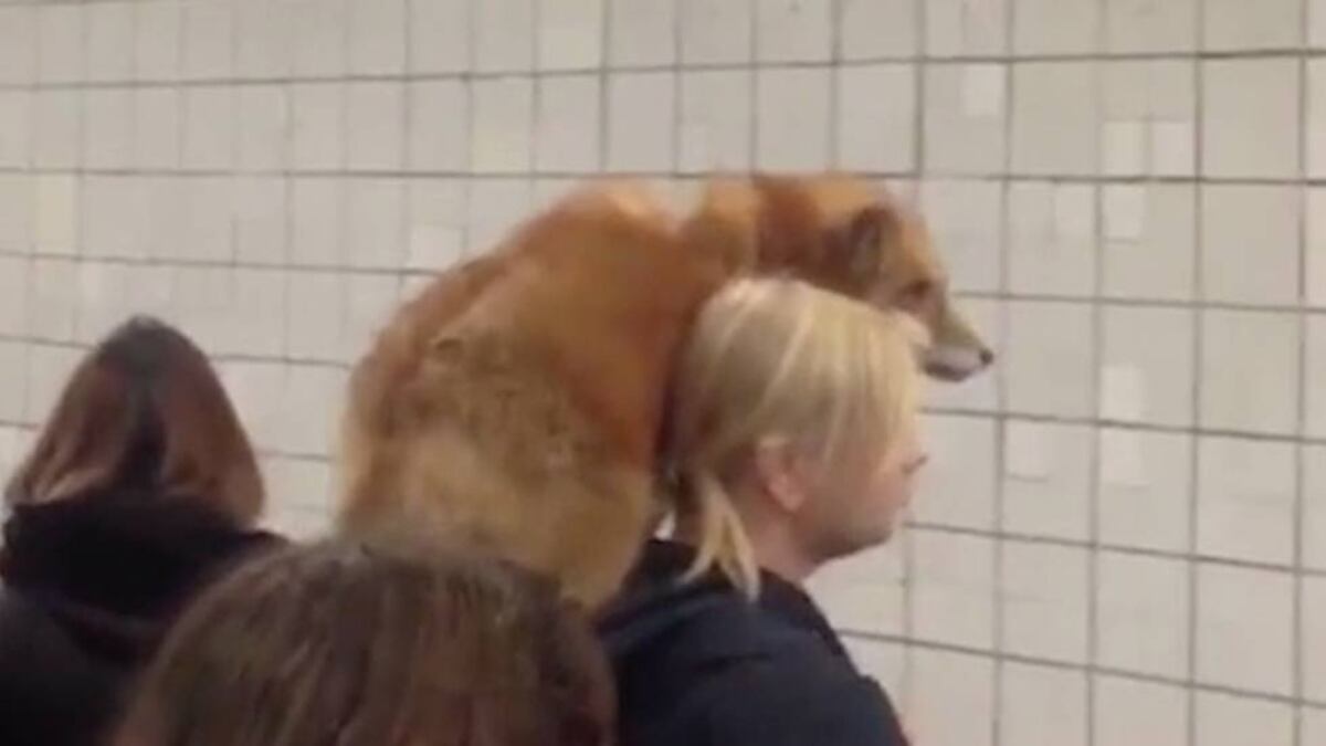 Una mujer carga en sus hombros a un zorro en el metro de Moscú