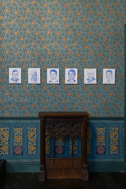 El propio escenario de la exposición es inmejorable, y no solo porque haya permitido hacer justicia a Oscar Wilde a solo unos metros de Clapham Junction, la estación en la que esperó el tren que le llevó a la cárcel de Reading mientras la gente le insultaba y escupía. “La galería de Studio Voltaire es una antigua capilla victoriana construida en 1896. Formaba parte de la Iglesia Wesleyana de Clapham”, explica Niamh Conneely. “Para crear el Templo de Oscar Wilde, hemos reemplazado la instalación eléctrica por candelabros, devuelto el nivel del suelo a su altura original recubriéndolo de madera, y forrado las paredes de papel pintado”. El cuidado de los detalles llega hasta el estampado del papel: está decorado con girasoles, la flor que llevó Oscar Wilde durante la gira de conferencias que dio en Estados Unidos para propagar el movimiento Arts & Crafts que ahora ha inspirado la decoración de su templo.