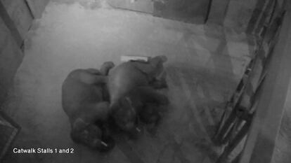 Chuck, un elefante que tiene diez años, y Jake, de 9, se abrazan para dormir juntos en el zoológico de Denver (Estados Unidos), en una escena grabada por las cámara de seguridad del recinto. Los animales se encuentran en un recinto recientemente inaugurado, ambientado en un safari, según informa la agencia Reuters. Los cuidadores de los paquidermos afirman que ambos elefantes han establecido un fuerte vínculo, como puede apreciarse en la grabación.