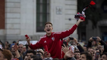 Camisetas, bombos y banderas de los aficionados tanto del River Plate como del Boca Juniors llenaron la capital madrileña un día antes de la histórica final de la Copa Libertadores. La peña de Boca Juniors en Madrid organizó esta mañana un banderazo en el hotel Mirasierra, donde está concentrado su equipo. Por su parte, los aficionados del River Plate se congregaron a las cinco de la tarde en la céntrica Plaza del Sol para animar a los suyos. El desenlace de la final se jugará en el estadio del Real Madrid, el Santiago Bernabéu este domingo a las 20:30 horas. EL PAÍS ofrecerá un amplio despliegue en vídeo durante toda la jornada, con tres puntos de directo propios, conexiones desde los lugares de concentración de las aficiones, y señal tanto desde Madrid como desde Buenos Aires.