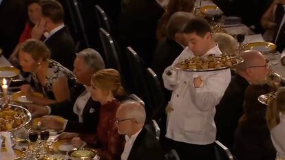 A un camarero de la gala de los Nobel se le cae una porción de comida sobre un asistente