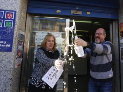 En la esquina de la calle, Jesús Angulo y su hija Marta se encontraban con la nube de fotógrafos y cámaras apostados delante de la administración. También les ha tocado. “Juego todas las semanas a este número. Mi hija me dijo esta mañana que había soñado que salía el 2”, indicaba aún sorprendido. Todavía no tenía claro qué va a hacer con el dinero. “Por lo pronto, mañana a trabajar —regenta el bar Güenterón en el barrio—, y el martes, a pensar”.