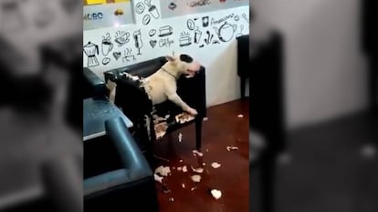Un perro Bull Terrier irrumpió en una heladería asustado por los ruidos de una tormenta y comenzó a morder un sillón del local, situado en la localidad de General Alvear en Mendoza (Argentina), según han informado medios locales. El propietario del comercio avisó a las autoridades para que controlaran al animal, que fue devuelto a su dueño de inmediato. Uno de los testigos grabó al perro en vídeo y compartió las imágenes el 17 de enero en redes sociales, donde ya acumulan más de 11 mil reproducciones.