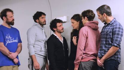 Seis sillas, una escalera y un diminuto cubículo de azulejos. Son los elementos que rodean a los seis actores de Jauría, la obra de teatro sobre el juicio de La Manada. La escena es asfixiante. Los cinco hombres rodean a la única mujer sobre el escenario que relata qué ocurrió la madrugada del 7 de julio de 2016 en un portal de Pamplona. Lo hace en el espacio reservado para los primeros ensayos en el Pavón Teatro Kamikaze, en el centro de Madrid, su antiguo gallinero. "Yo no hago trabajo de mesa. Toda esa parte de análisis de texto lo hago en pie. La memorización de este texto es complicada, pero la mesa al final sirve de parapeto, prefiero hincarle el diente al texto ya empezando a encarnar", subraya el director, Miguel del Arco. Es 17 de diciembre y a Jauría, escrita por Jordi Casanovas mediante la transcripción directa de las sentencias de la Audiencia Provincial de Navarra y la del Tribunal Superior de Justicia, le queda aún mucho por delante.