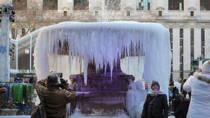 "Es una locura, estoy buscando un sitio donde esconderme". "Es helador". "Todo está congelado". "Hace mucho frío. Muchísimo". Son algunos de los testimonios que se pueden escuchar estos días durante un paseo por Nueva York. Es una de las ciudades a las que ha llegado el frío extremo del vórtice polar que afecta a Estados Unidos. A 18 grados bajo cero, incluso las fuentes parecen esculturas de hielo, transmitiendo una sensación común entre los neoyorquinos: "Llevo aquí toda mi vida, nunca había hecho tanto frío".