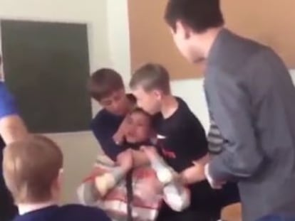 Jonathan Clark, profesor de ciencias del Centro Educativo Clovis North (California, Estados Unidos), se ha hecho famoso en Twitter tras colgar en los últimos días varios vídeos donde se ve cómo al terminar sus clases hace un espectacular mate para deleite de sus alumnos. En las imágenes se ve cómo salta por encima de alguno de ellos, supera los tapones que le intentan hacer o realiza giros muy complicados, y todo dentro del aula. Clark llamó también la atención de los medios hace un par de meses cuando en un concurso de mates durante el descanso de un partido de los Lakers dejó al público anonadado.