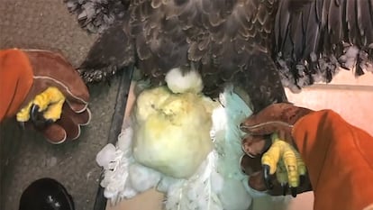 Una bola de hielo de 20 centímetros formada en las plumas de un águila