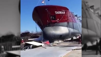 El empleado de un astillero naval estuvo a punto de ser arrollado por un barco en su ceremonia de inauguración