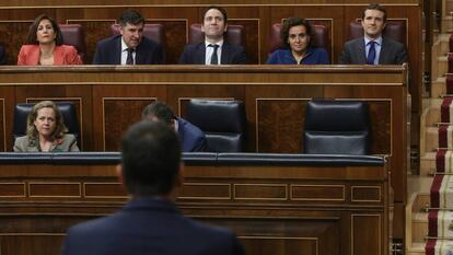 La virulencia de Unidos Podemos contra Pedro Sánchez en la última sesión de control al Gobierno se resentía de cierta sobreactuación y tacticismo, pero contribuía a identificar el aislamiento del presidente del Gobierno, no ya zarandeado por la pinza de Casado y de Rivera en discursos intercambiables, sino expuesto al rechazo o al despecho de los partidos soberanistas.