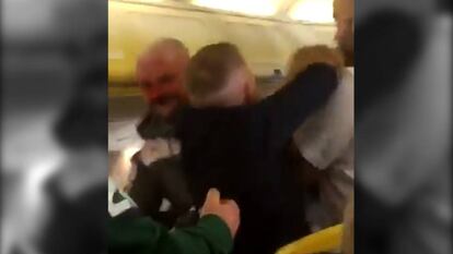 Eran las seis de la mañana del pasado sábado y un avión de Ryanair acababa de despegar desde el aeropuerto de Glasgow (Escocia) con destino Tenerife. Minutos después, ya en pleno vuelo, dos hombres se enzarzaron en una pelea, como muestra un vídeo grabado por un pasajero. ¿El motivo? Al parecer la novia de uno de ellos se había descalzado y al otro pasajero implicado en la trifulca le molestó la actitud.