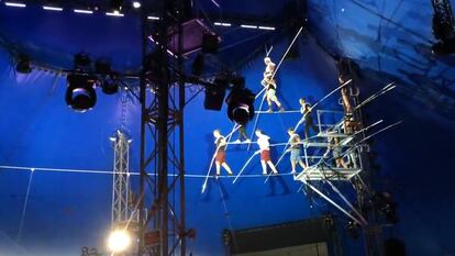 Ocurrió en 2017, pero han tenido que pasar dos años hasta que las imágenes han salido a la luz. El periódico local Sarasota Herald Tribune, de Florida, EE UU, ha difundido el vídeo del terrible accidente que sufrieron cinco funambulistas al caer desde una altura de nueve metros cuando intentaban hacer una pirámide humana de ocho personas sobre la cuerda floja. El grupo liderado por Nik Wallenda, un acróbata estadounidense famoso por ostentar varios récords mundiales, perdió el equilibrio en mitad del número que en ese momento estaban ensayando a dos días del estreno en el circo de Sarasota.