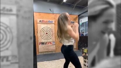 Ainsley Rae acudió junto a su novio a un centro de lanzamiento de hachas el pasado fin de semana en Colorado (Estados Unidos) para probar sus habilidades. La joven lanzó sin la fuerza y el efecto adecuados y el hacha no solo no dio en la diana sino que rebotó en el suelo y estuvo a punto de golpearle en la cabeza. Afortunadamente, pudo esquivar la herramienta a tiempo, aunque por milímetros, y ella misma ha colgado en Instagram el vídeo del instante acompañado del texto: "Casi me da". En la imagen también se observa cómo la mujer respira aliviada después del impactante momento. El lanzamiento de hacha se popularizado en Estados Unidos como una actividad que ayuda a liberar el estrés.