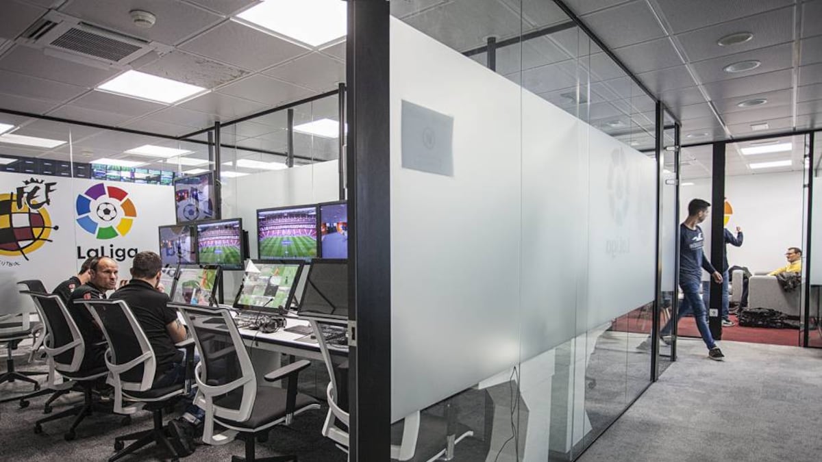 El VAR que opera en LaLiga se esconde tras una anodina puerta de maderas claras que mide unos tres metros de alto por uno de ancho. Solo pueden abrirla un puñado de árbitros y técnicos de imagen y sonido durante cada jornada de Primera División. Lo hacen tras posar su huella dactilar sobre un lector digital. No hay cartel ni señal alguna que anuncie lo que hay al otro lado de la puerta, ubicada en el diáfano corredor de la planta baja del edificio que ocupa el Comité Técnico de Árbitros de la Real Federación Española en la Ciudad del Fútbol de Las Rozas, a las afueras de Madrid. Poco antes del partido que vigilará esta tarde desde una de las ocho cabinas del VAR, Mateu Lahoz abandona un momento el cubículo para ir al baño, que está fuera de esta zona de acceso restringido. Una vez suene el pitido inicial, no podrá salir de aquí hasta el intermedio. Tras regresar del baño a paso ligero, posa el dedo índice sobre el lector digital y abre la puerta misteriosa que esconde el resplandor de las pantallas encendidas al otro lado.