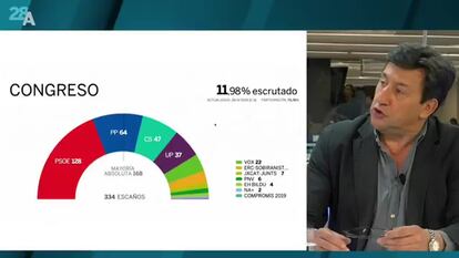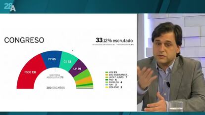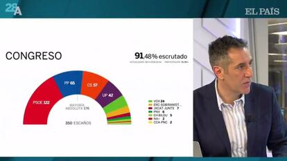 EL PAÍS Vídeo ha emitido un programa especial en directo de la jornada electoral en el que periodistas y analistas del diario han analizado el escrutinio y el recuento de los votos electorales. El espacio, presentado por Carlos de Vega, ha contado con los reporteros desplazados a los principales puntos de interés de la jornada y con el análisis de la directora del periódico, Soledad Gallego-Díaz; el adjunto a la dirección, Joaquín Estefanía; el director adjunto Jan Martínez Ahrens; la directora de Opinión, Máriam Martínez-Bascuñán; la subdirectora Montserrat Domínguez; y los periodistas y analistas Javier Casqueiro, Guillermo Rodríguez, Gabriela Cañas, Teodoro León Gross y Rubén Amón, entre otros.