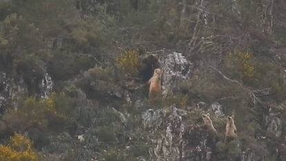 Un macho se acerca a una osa con sus dos crías. Ella se interpone entre los oseznos y el ejemplar que intenta cortejarla. Incluso se enfrenta a él. El ritual, grabado por la Fundación Oso Pardo en la cordillera Cantábrica, es una señal habitual de que algo importante está a punto de sucederle a los dos pequeños, que rondan el año y medio de vida: dentro de unos días emprenderán una vida separados de su madre.