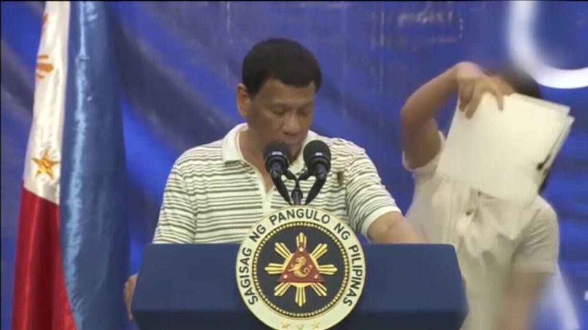 El presidente de Filipinas, Rodrigo Duterte, ha sido interrumpido por una cucaracha durante un discurso celebrado en la noche del miércoles en la provincia filipina de Bohol. El insecto apareció, de repente, en el hombro izquierdo del presidente. Un asistente intentó apartarla de encima, pero es Duterte el que acaba quitándola de en medio de un manotazo. El líder no parece alarmado por la presencia del insecto y unos minutos después continúa con el discurso como si no hubiese pasado nada.