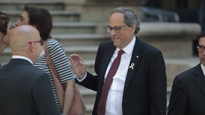 Quim Torra ha prestado declaración esta mañana por desobedicencia con los lazos amarillos; precisamente el mismo día en que la Fiscalía ha introducido el sintagma "organización criminal" para el 1-O. Y, sin embargo, de Torra puede decirse que ha hecho algo inusual en política: cumplir con aquello para lo que fue elegido. Al jurar el cargo, en aquella ceremonia discreta celebrada en el Salón de la Verge de Montserrat, no en el Salón Sant Jordi, eludió comprometerse con la Constitución o el ordenamiento jurídico vigente. Asumiendo el rol de vicario de Puigdemont, cuya medalla estaba sobre la mesa como símbolo religioso —escoltados por la Virgen de Montserrat y Sant Jordi— se había enmarcado el acto "en la estricta legalidad catalana". Torra llevaba un lazo amarillo, y no precisamente discreto como Roger Torrent. En el caso de Torra, más un president con lazo amarillo, parecía un lazo amarillo con president.