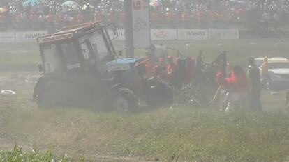 Uno de los participantes del rally de tractores Bizon-Track Show, que se celebra en el sur de Rusia, estuvo muy cerca de atropellar a un grupo de periodistas. Tras pasar por una zona encharcada, el conductor perdió el control del vehículo y, al salirse de la pista, impactó en una zona donde se encontraban varias personas grabando la competición, la semana pasada. Afortunadamente, los periodistas pudieron apartarse a tiempo y no hubo heridos.