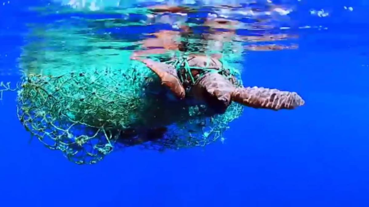 Un grupo de pescadores encontró a este ejemplar de tortuga boba atrapada en una red de plástico