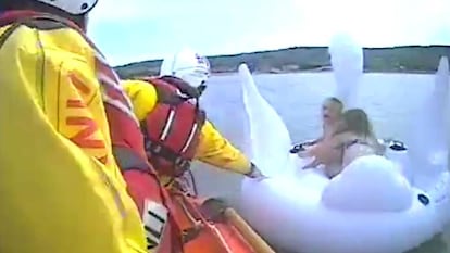 Dos niñas, de cinco años, fueron rescatadas este sábado después de ser arrastradas de la playa por una fuerte ráfaga de viento en la costa Minehead, en Reino Unido. Las pequeñas estaban sentadas en el flotador con forma de cisne mientras su padre las sostenía con una cuerda en la orilla, cuando esta se la escapó de sus manos. El padre se metió en el agua y trató de nadar hacia ellas, pero el viento ya había empujado el flotador a varios metros de distancia. Al ver que no había forma de alcanzarlas, gritó a las niñas que se quedaran en la colchoneta y luego la familia avisó a la guardia costera. Minutos más tarde llegaron dos botes salvavidas de la organización 'Royal National Lifeboat Insitution' (RNLI) y un helicóptero de guardacostas para rescatar a las pequeñas. "Cuando llegaron, el flotador estaba a unos 800 metros de la costa, y aún se movía rápidamente hacia el mar", dijo Phil Sanderson, voluntario del bote salvavidas. También comentó que el padre "hizo exactamente lo correcto" al gritarles a las niñas que se quedaran en el cisne inflable hasta que las rescataran. Los funcionarios de RNLI están investigando por qué no se estaban ondeando banderas rojas de advertencia en el frente marítimo de Minehead.